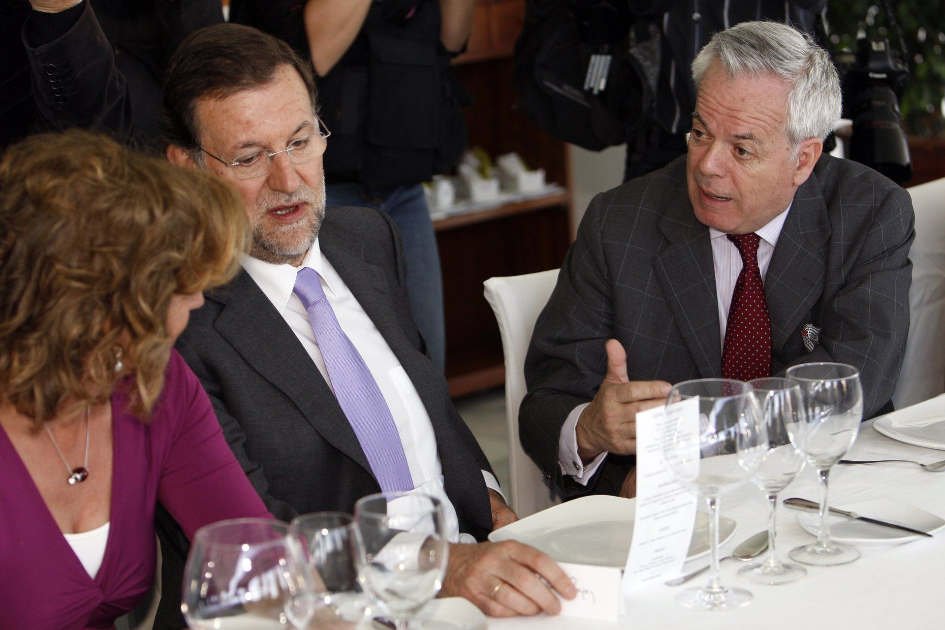 2010, abril. En aquella comida traté de convencer a Rajoy de la importancia de mantener posiciones de principios, con escaso éxito. Aznar decidió colocarme en la mesa junto a Rajoy para que le impartiera doctrina liberal. No estuvo Rodrigo Rato, el único que faltó.